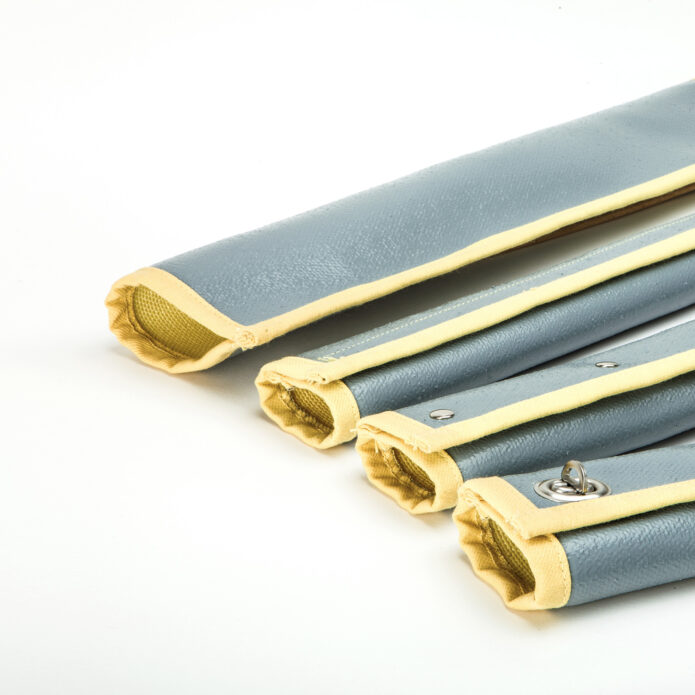 Die Protector™ Feuerschutzschläuche Typ Variabel sind mit verschiedenen Verschlussarten erhältlich. Die Nähte bestehen aus hitzebeständigem Aramid-Nähgarn (max. +500°C) oder Glas-Nähgarn mit V2A Drahtverstärkung (max. +900°C). Keine Durchschlagsfestigkeit angegeben.